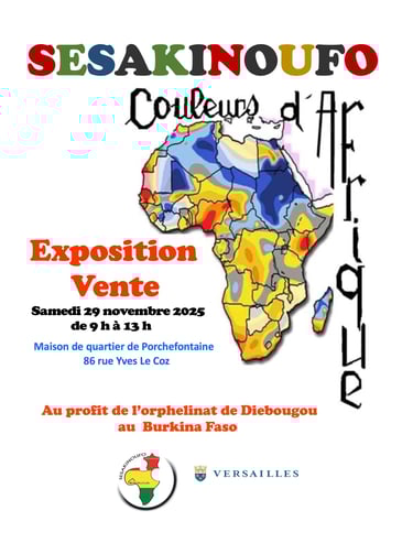 Samedi 18 novembre, dans le cadre du Festisol (Festival des Solidarités de la Ville de Versailles), Stand Sesakinoufo, pour vous renseigner et profiter de la vente d'objets, sur la place du Marché Notre-Dame, Carré à la Marée